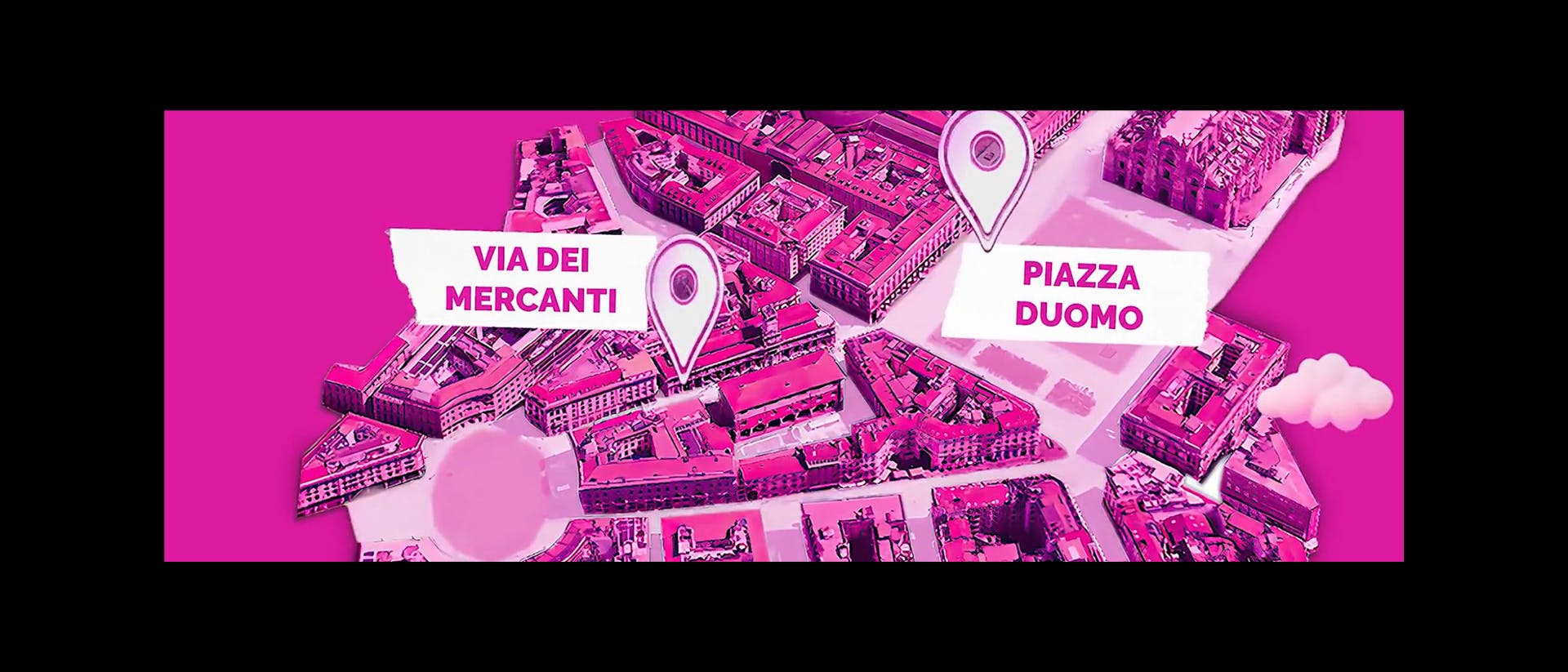 An AR billboard in Via Mercanti lets users scan a QR code to watch nearby buildings blush in vibrant fuchsia.